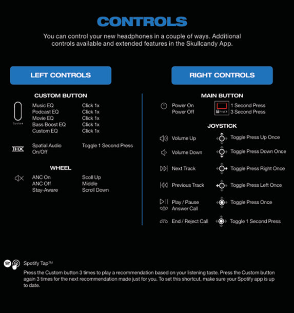 When you first power on your headphones, THX Spatial Audio is off by default. You can turn ON THX Spatial Audio & Head Tracking by pressing and holding the custom button for 1 second. You will hear a voice prompt “THX On”. You can turn OFF THX Spatial Audio, by pressing the custom button for 1 second. You can also toggle THX Spatial On/Off from the Skullcandy APP.