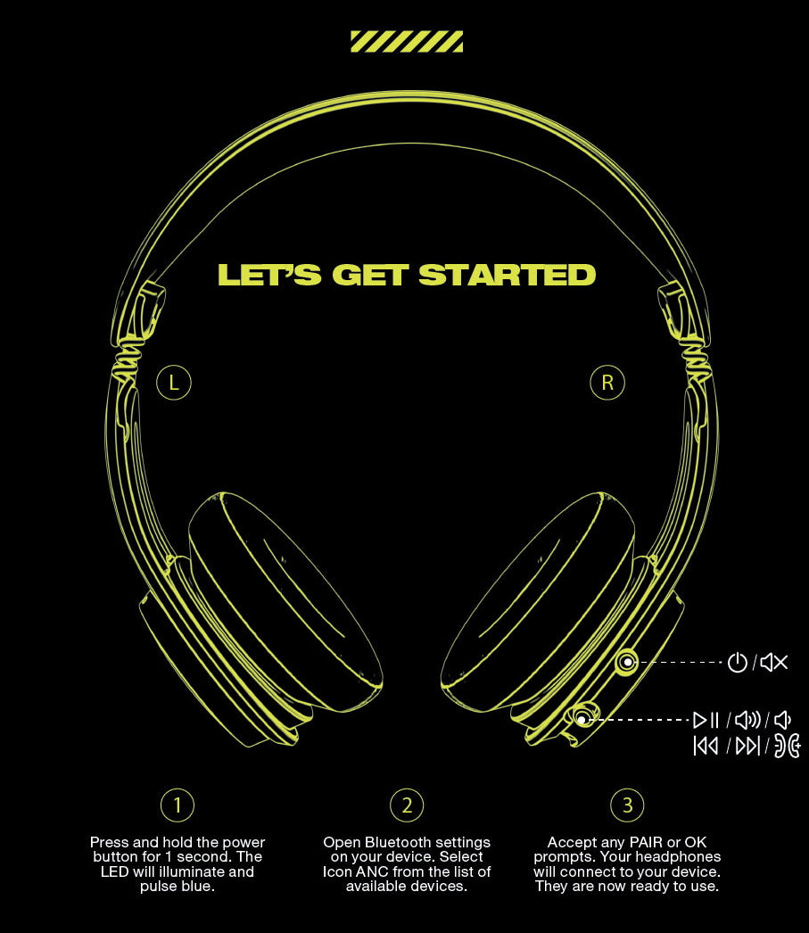 Another quick way to enter Pairing Mode when your headphones are off is to press and hold the power button for 3 seconds. Your Icon ANC will power on and enter directly into Pairing Mode.