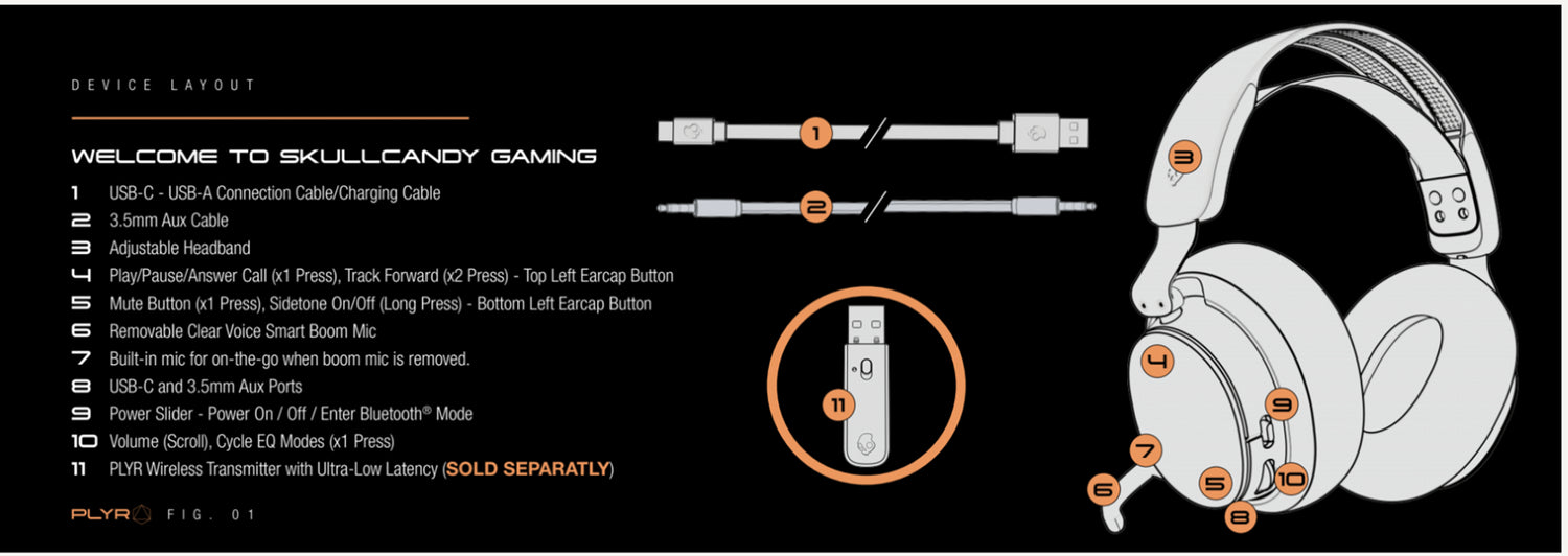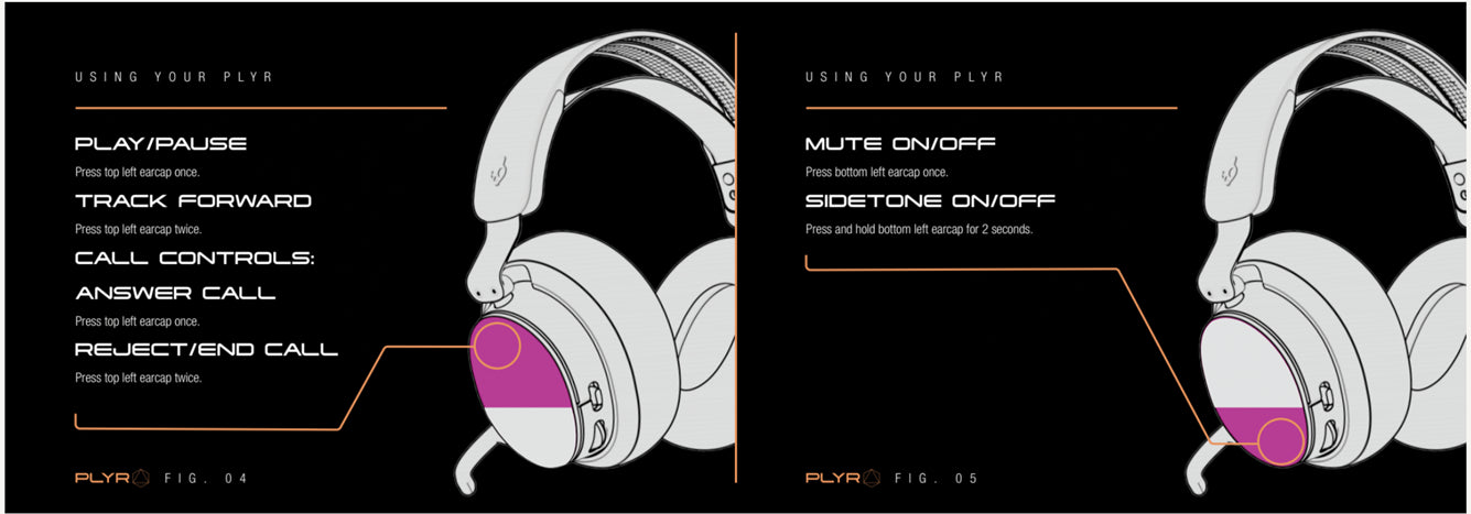 Out of the Box, your PLYR has a removable sticker on the left earcup with user control instructions.