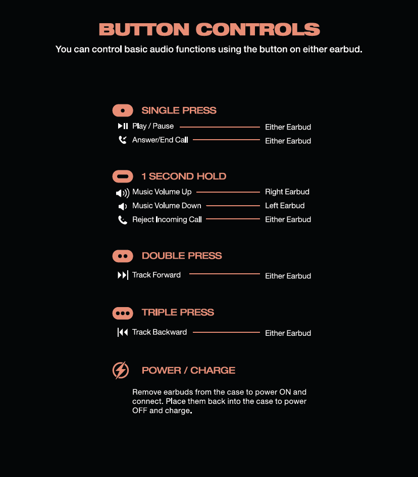- Remove BOTH earbuds from the charging case, a tone and will indicate your earbuds are powered ON.