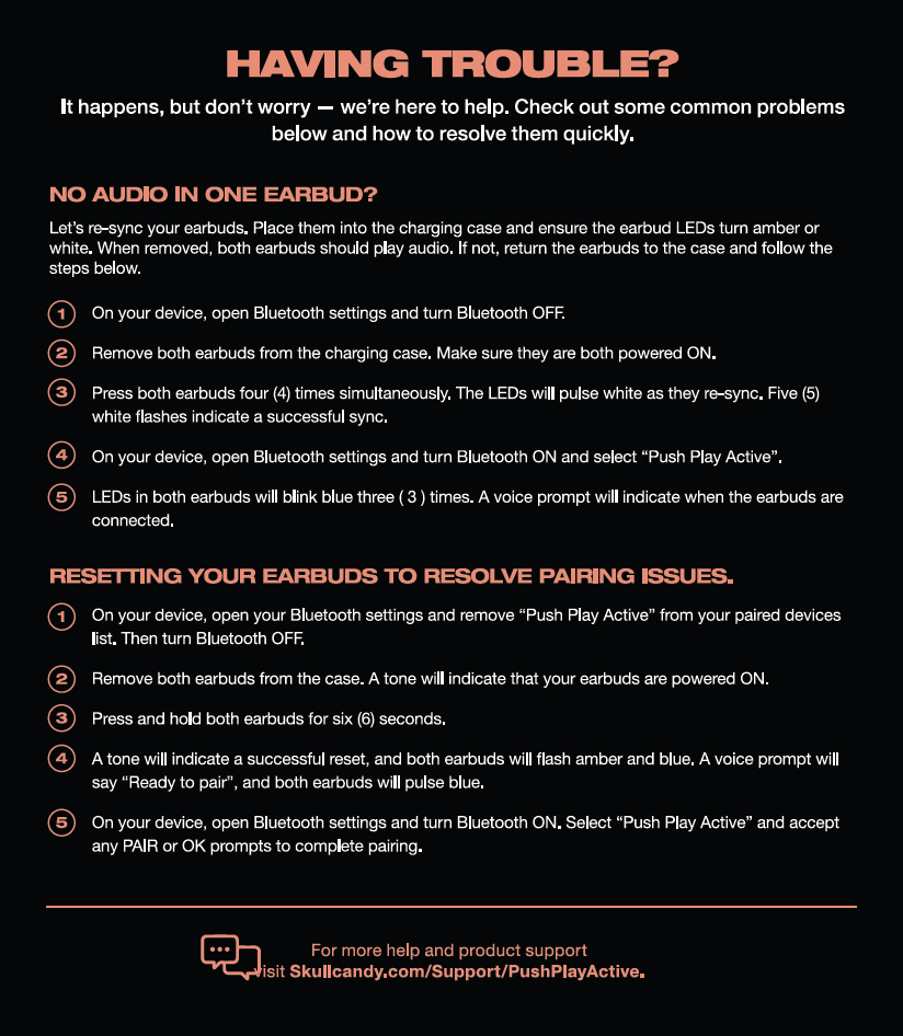 - Push Play has stereo (both earbuds) calling and streaming so you’ll always hear the caller or your content in both ears.