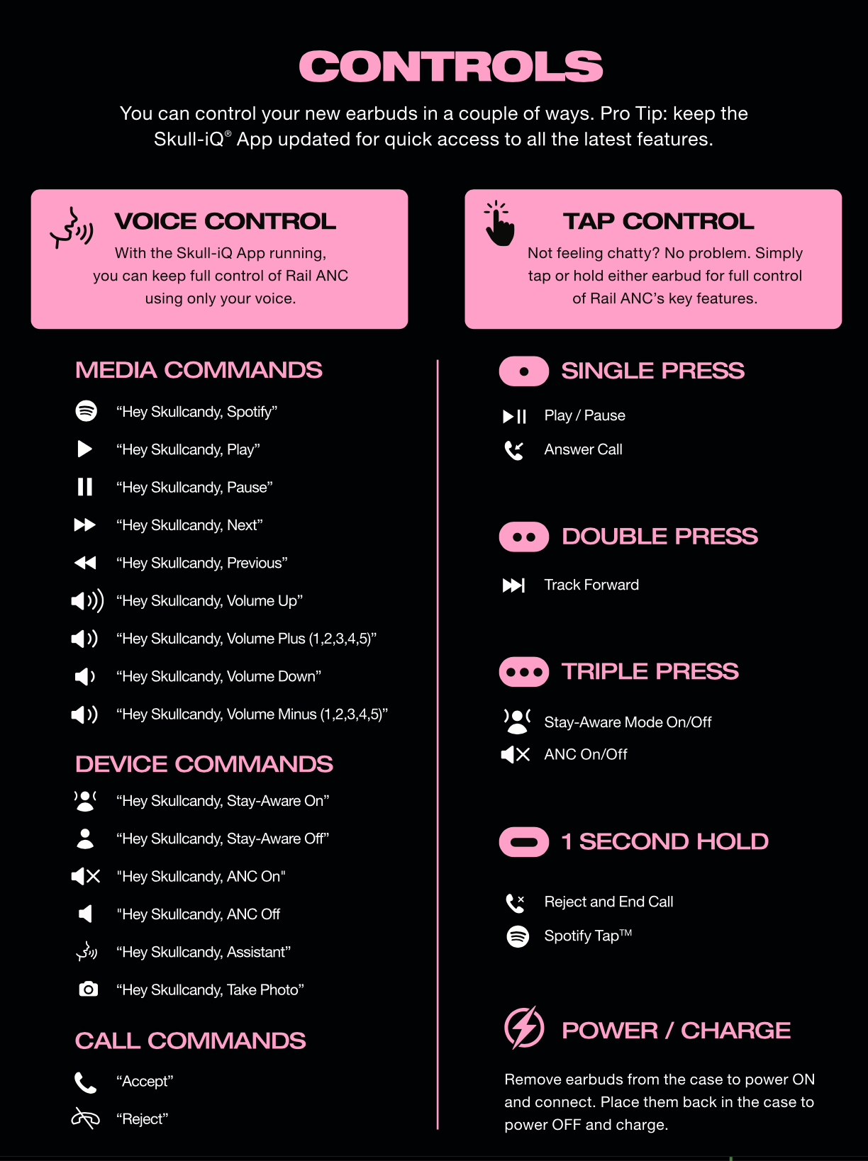- No “wake word” is needed for this feature, so you don’t have to say “Hey Skullcandy” before these commands.