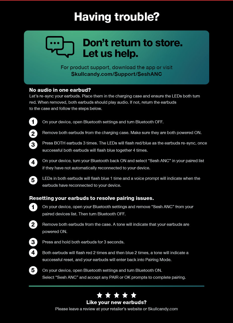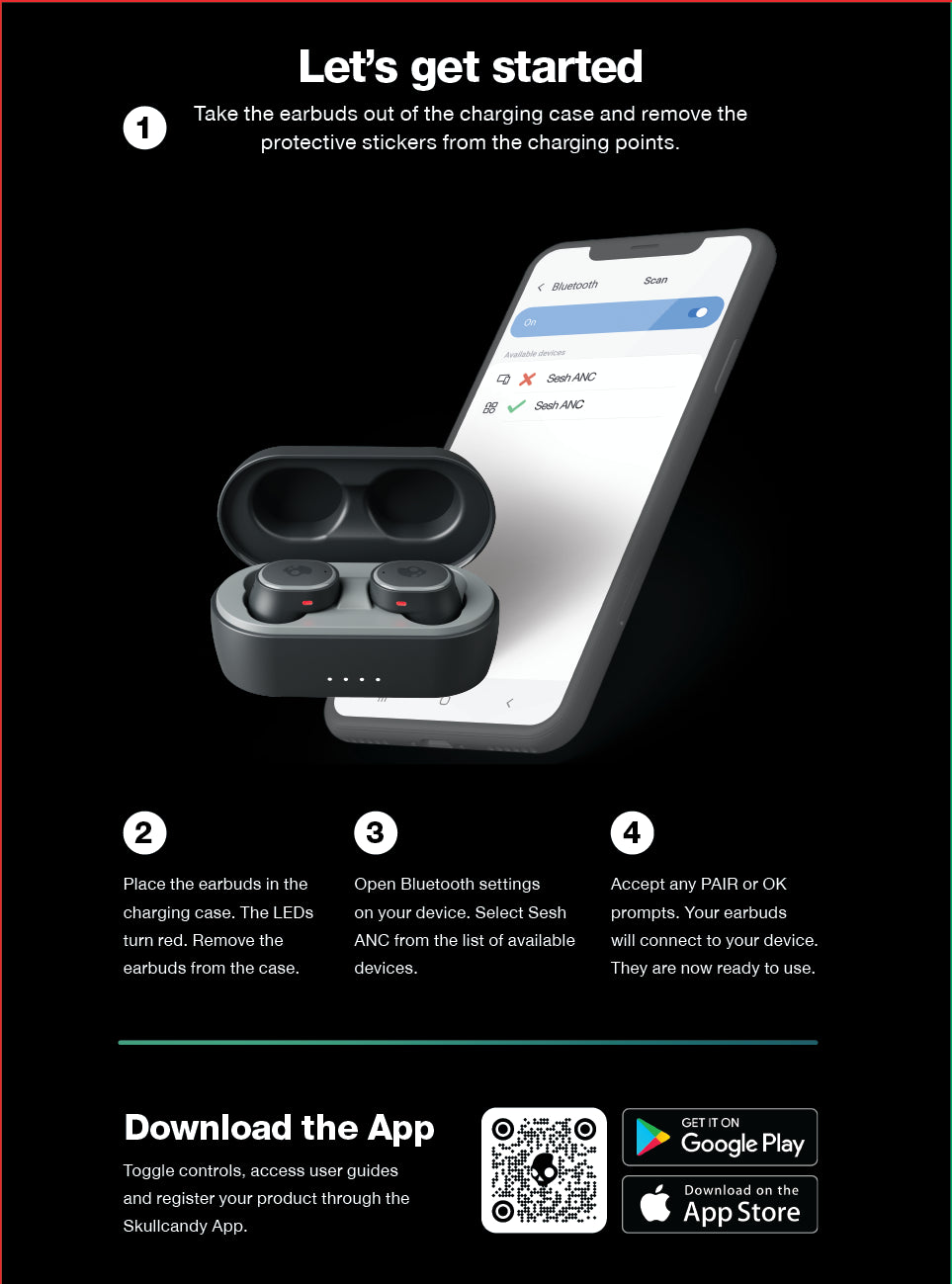 To unlock and control all of the incredible Sesh ANC features, scan the QR code found on the front of your packaging, in your Quick Start Guide or User Guide, and effortlessly download the Skullcandy App.