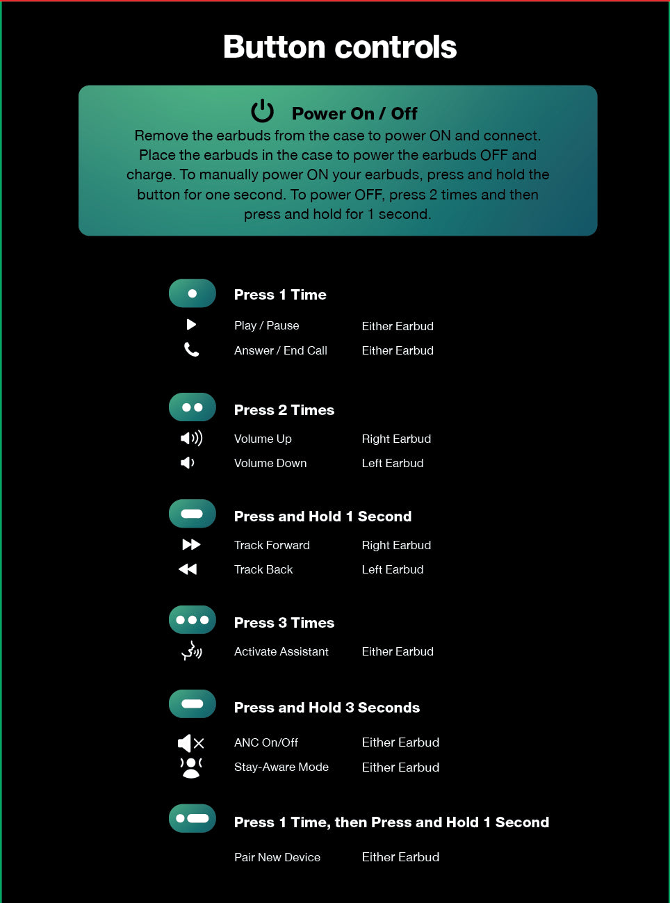 - To pair to a new device while you are currently Powered On and either disconnected or connected to a device, simply press EITHER earbud button 1x and then press and hold the same button 1 second. This will enter both earbuds into Pairing Mode.
