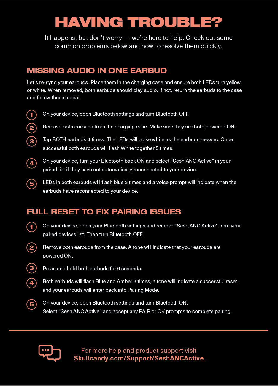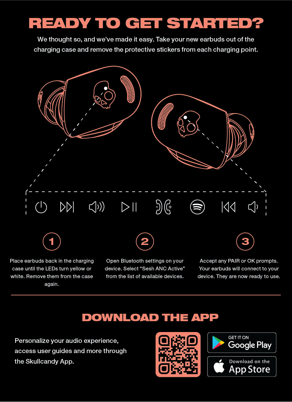 To unlock and control all of the incredible Sesh ANC Active features, scan the QR code found on the front of your packaging, in your Quick Start Guide or User Guide, and download the Skullcandy app.