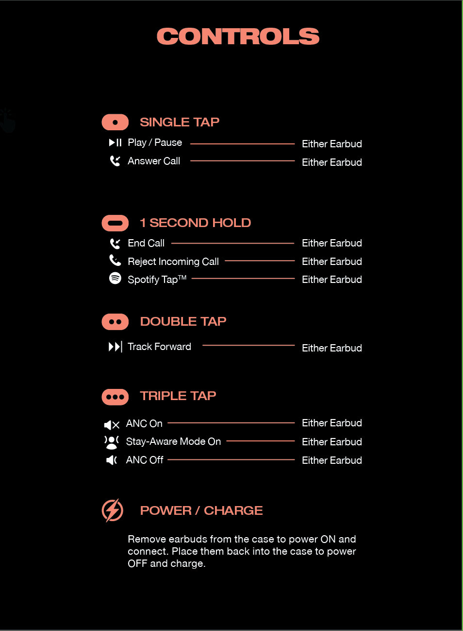 - To directly access Spotify, press the touch sensor on either earbud for 1 second (1s hold)