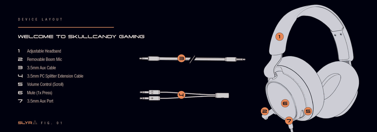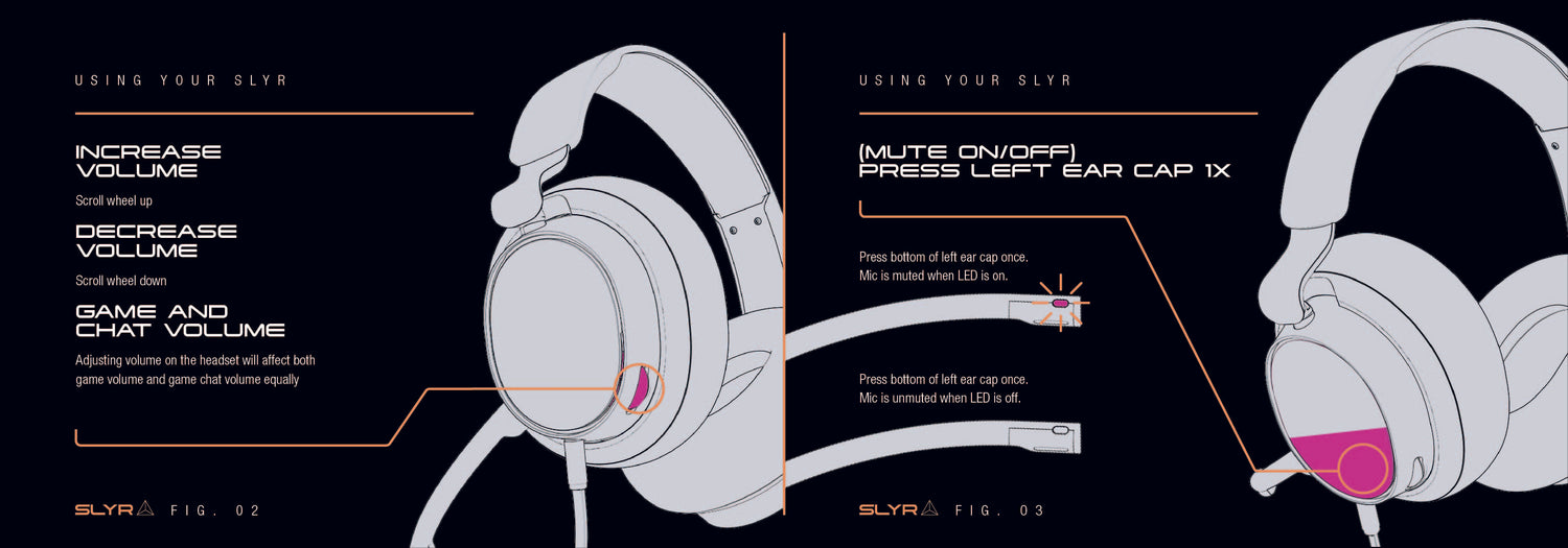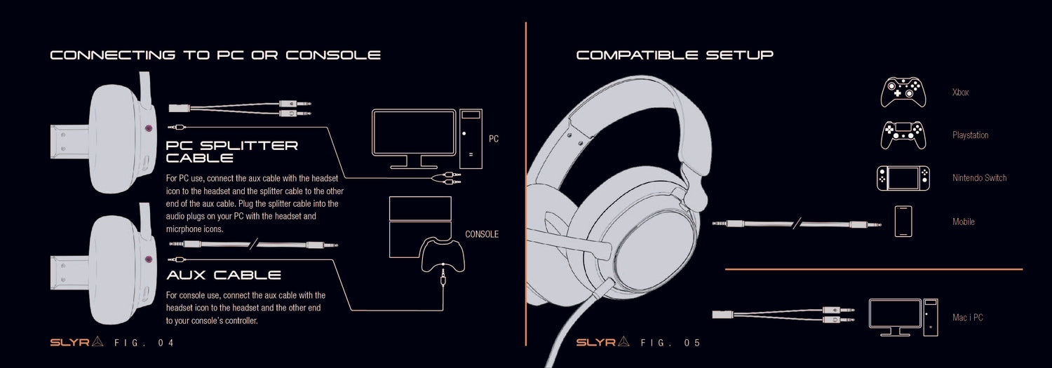 - The 3.5mm aux cable has specific labeled ends meant to plug into both headset and gaming/audio device. One end of the cable has a “Headset” icon, the other has a “Game Controller” icon. Insert the end of the cable showcasing the “Headset” icon into SLYR’s, 3.5mm aux port located on the under-side of the left-earcup. Insert the end of the cable showcasing “Game Controller” icon into gaming/audio device.