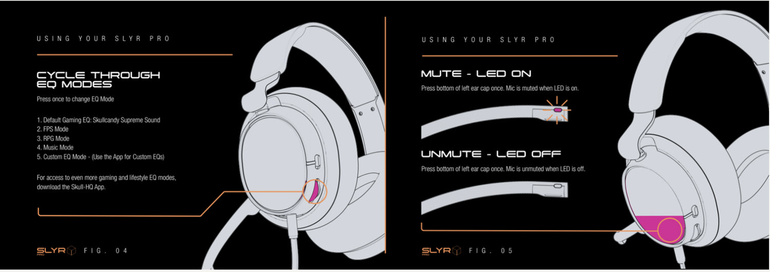 Out of the Box, your SLYR Pro has a removable sticker on the bottom-end of the left earcup with “Tap to Mute” user control instructions.