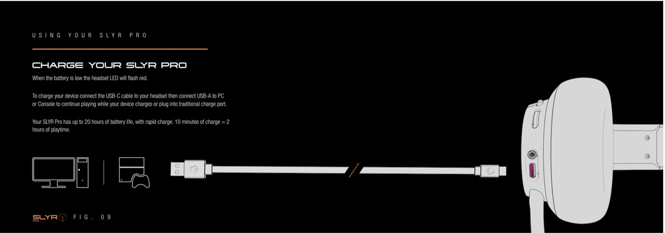 - YES! – SLYR Pro has Rapid Charge technology via the provided USB-C cable and internally for the Headphones.